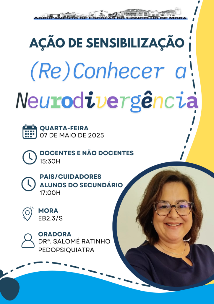 Convidam-se todos os interessados a estarem presentes para a ação de sensibilização Re(Conhecer) a Neurodivergência com a oradora convidada Drª. Salomé Ratinho (Pedopsiquiatra), a realizar no dia 07 de maio. O horário das sessões encontra-se no cartaz.