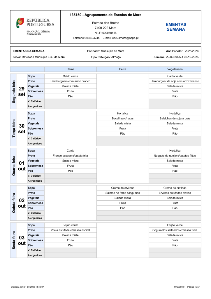 Ementas refeitório EBS Mora (29 de setembro a 5 de outubro)