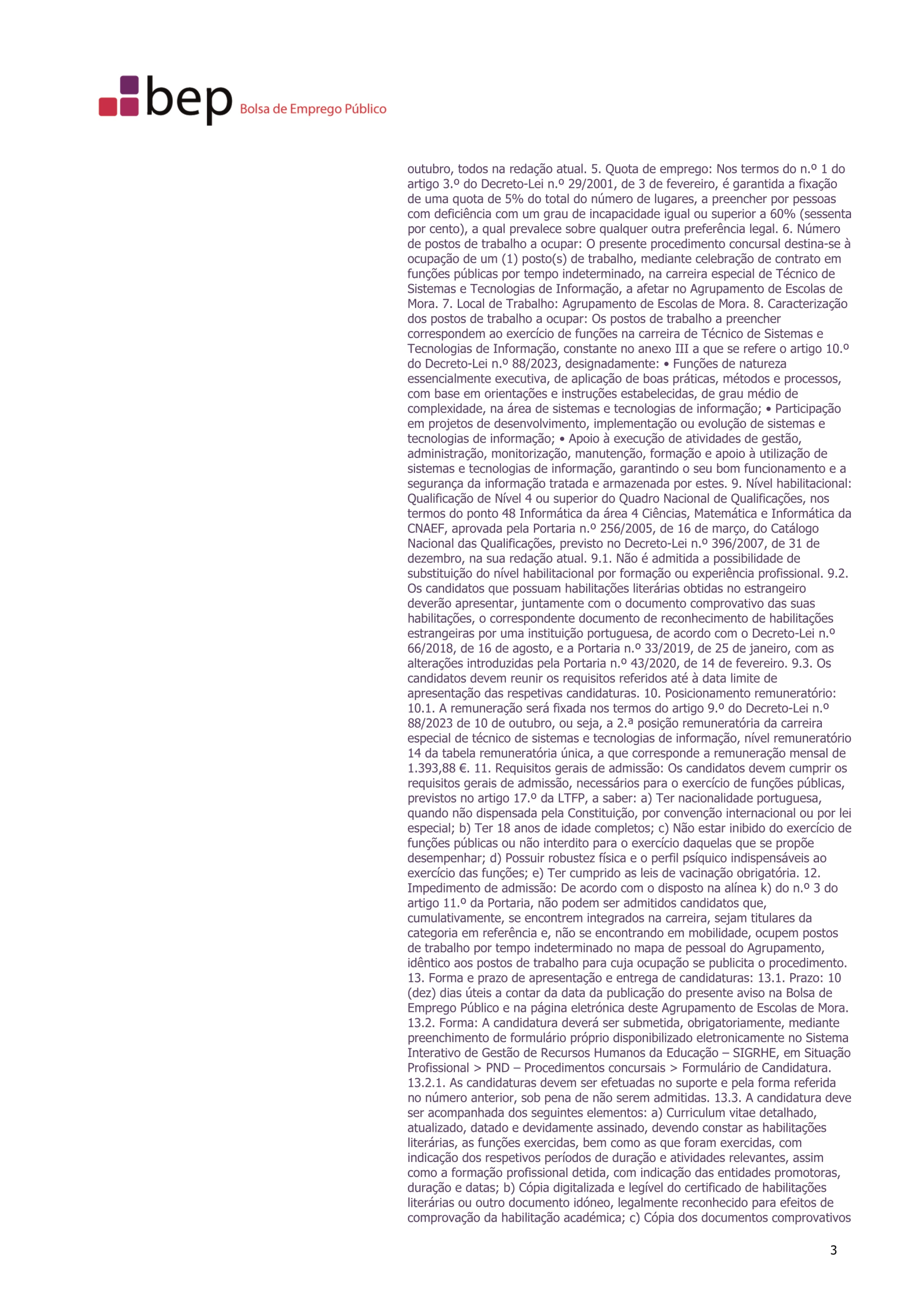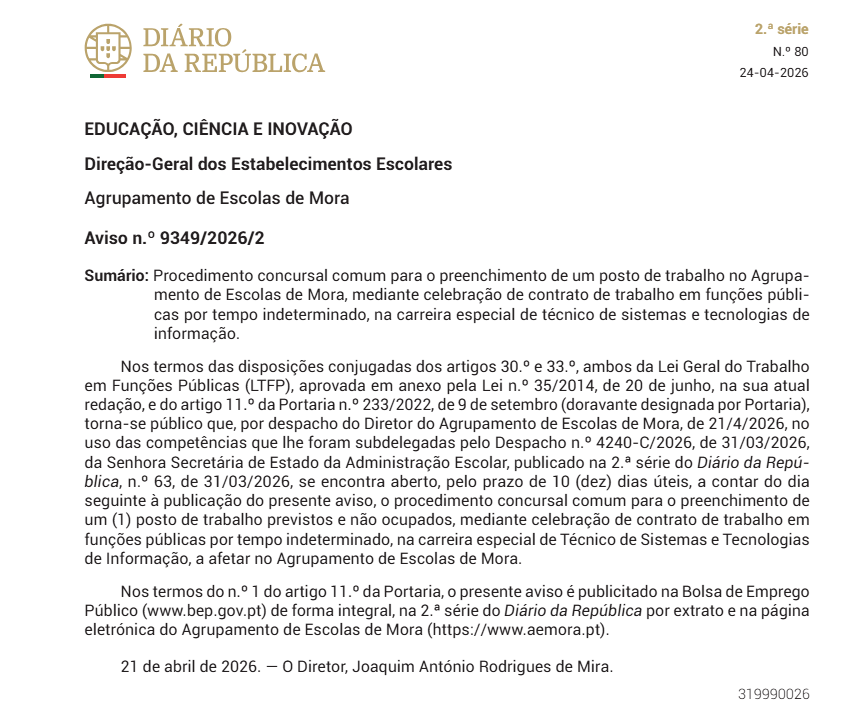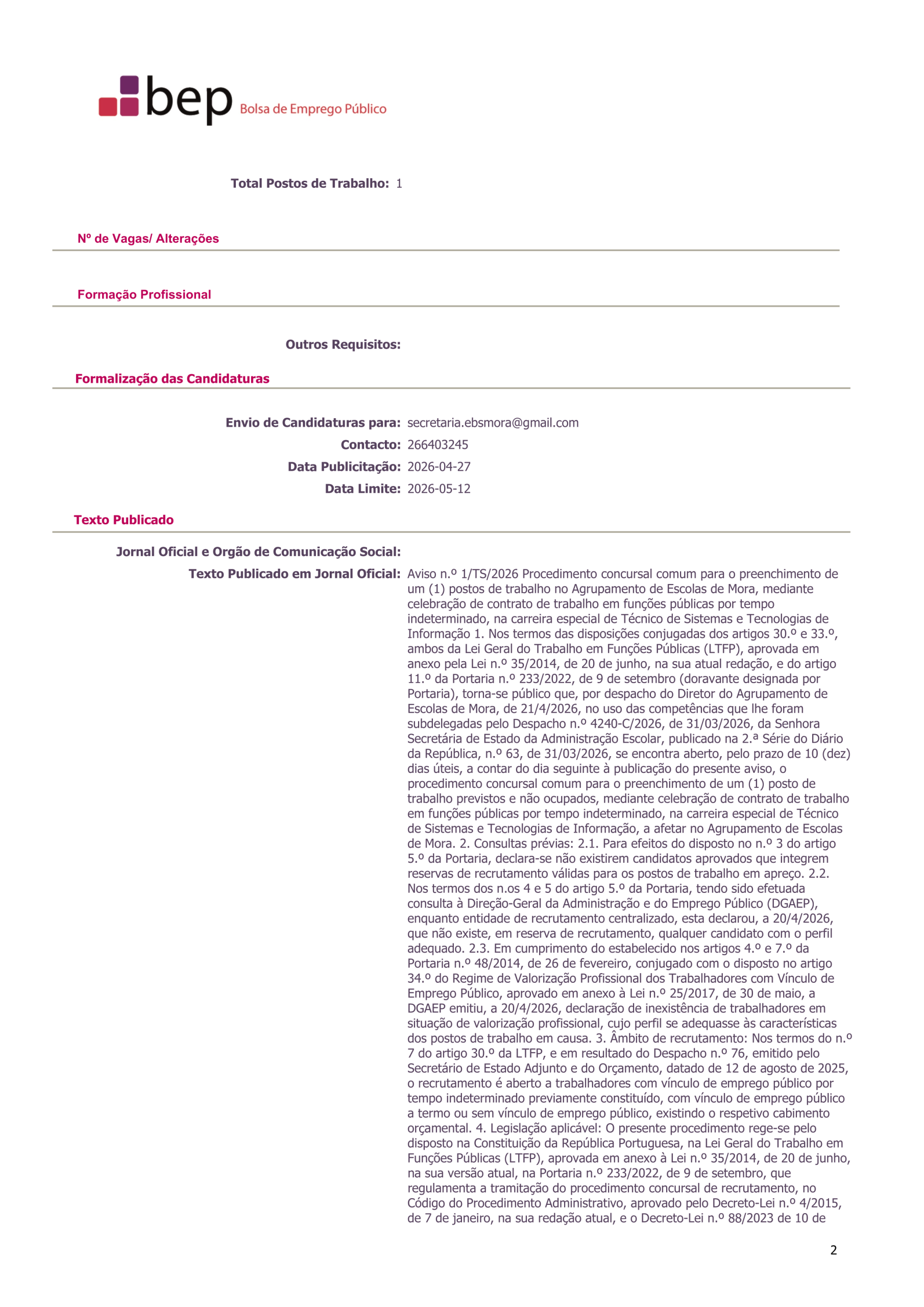 Concurso para Técnico de Sistemas e Tecnologias de Informação. Diário da República Aviso BEP…